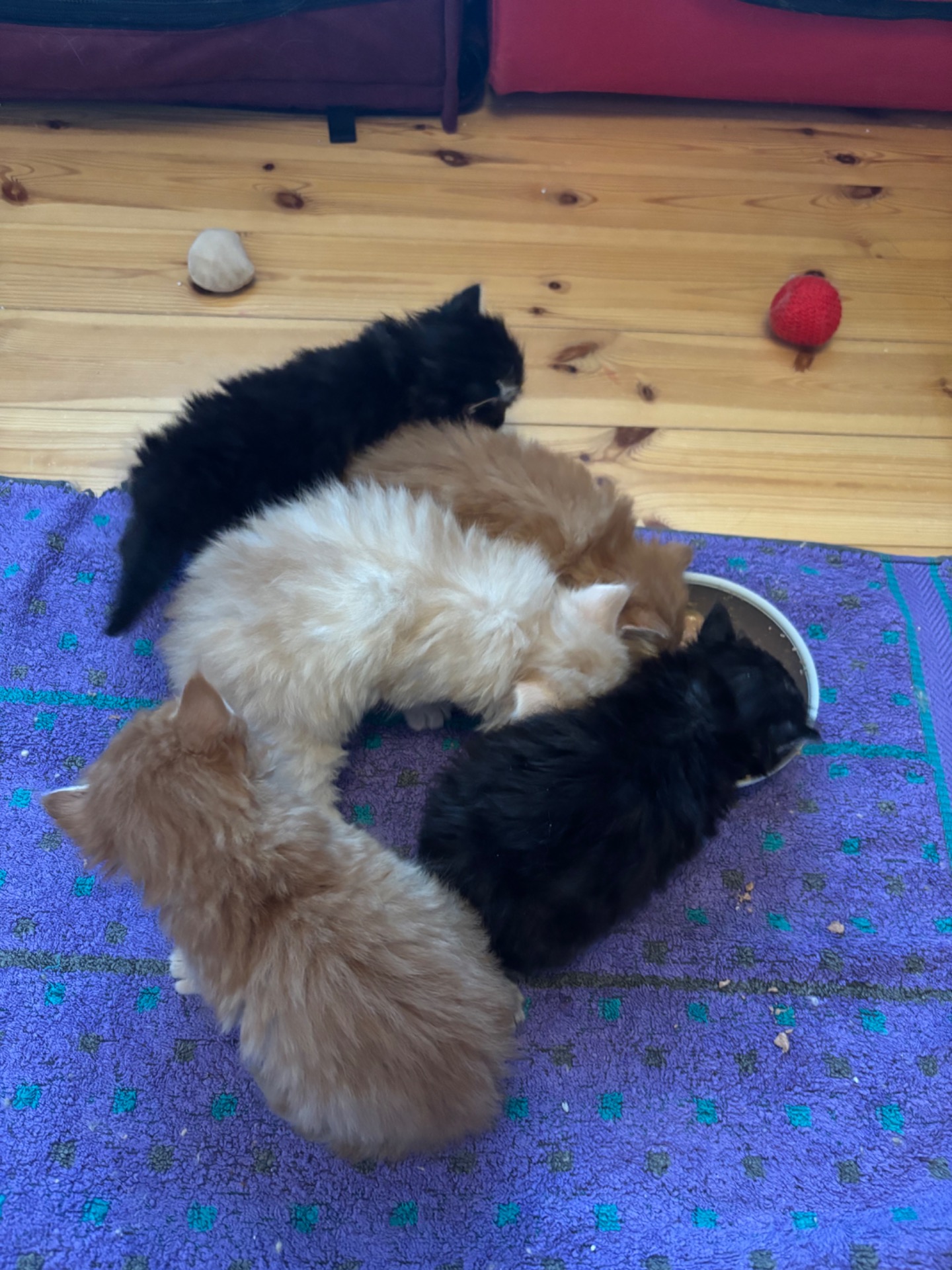 Pennut täyttävät pian neljä viikkoa. Kiinteän ruuan syöntiharjoitukset ovat alkaneet ja pojat tekevätkin ansiokkaasti tuttavuutta baby-moussen kanssa. Mammakissa saakin sitten olla putsaamassa moussea naamasta ja tassuista… Iines luottaa toistaiseksi ainoastaan mamman maitoon, mitä nyt vähän käy haistelemassa ruokakupilla. Emon maito on toki vielä pitkään kaikkien pentujen pääasiallinen ravinto.